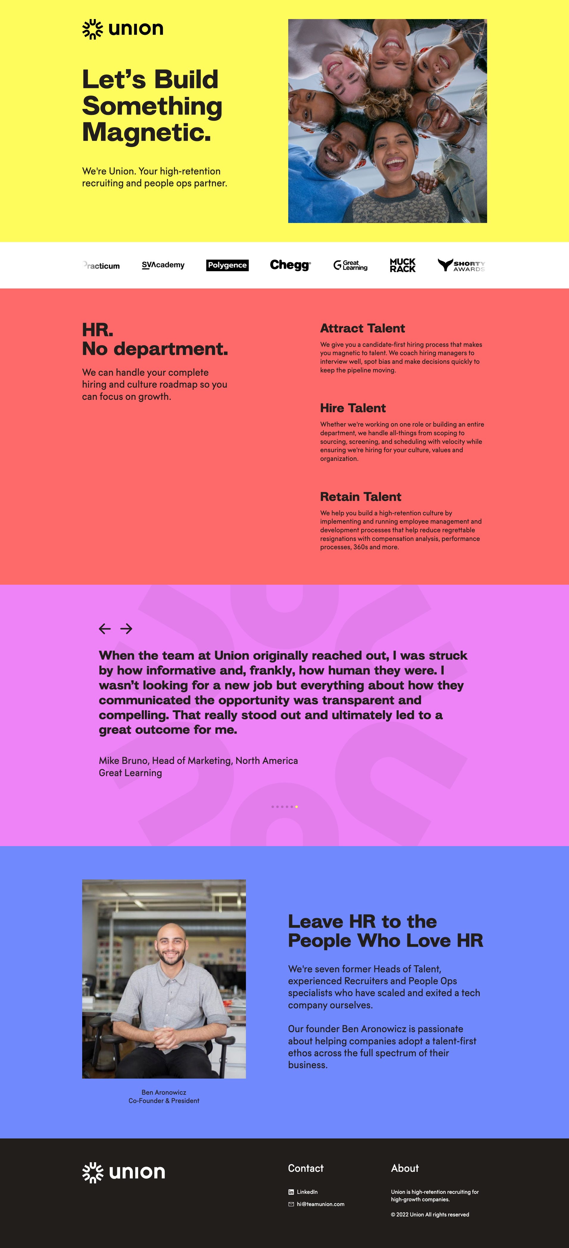 Union is a People Operations and Recruiting firm for high-retention startups. They work with clients to build or upgrade any process, tools, and performance management policies necessary so their candidates, and everyone their clients hire, succeed long-term.